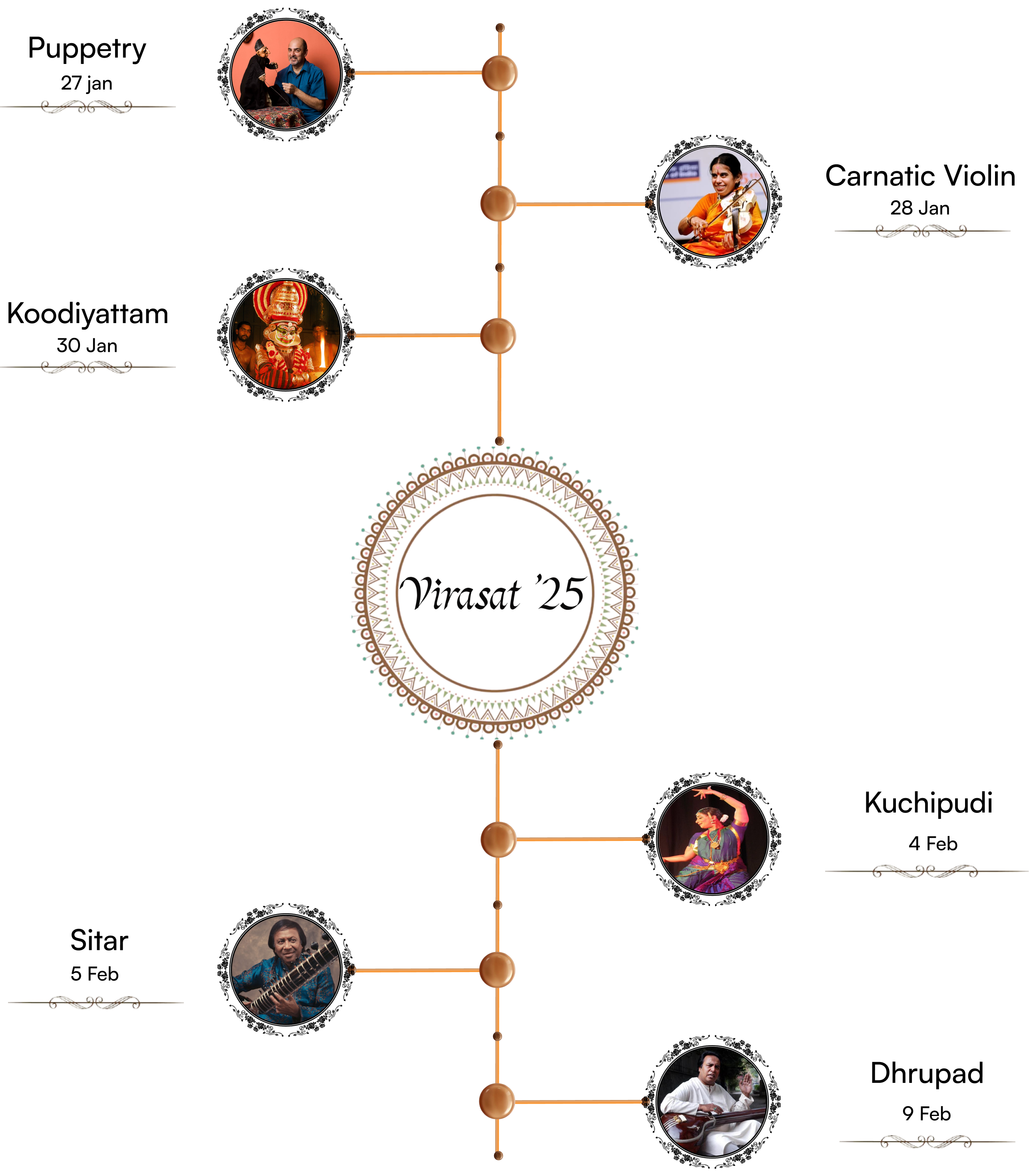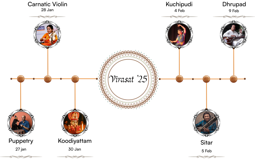 Virasat is an annual event by SPIC MACAY's IIT Roorkee Chapter, celebrating Indian classical music, art, and culture. Virasat'25 is a 14 days event, including artist's performances, intensives, movie screening, talk session and holistic food festival. Three interactive workshops on Tabla, Kuchipudi and Matani Pachedi art of Gujarat will offer participants hands-on experience and a deeper appreciation of these traditional art forms.